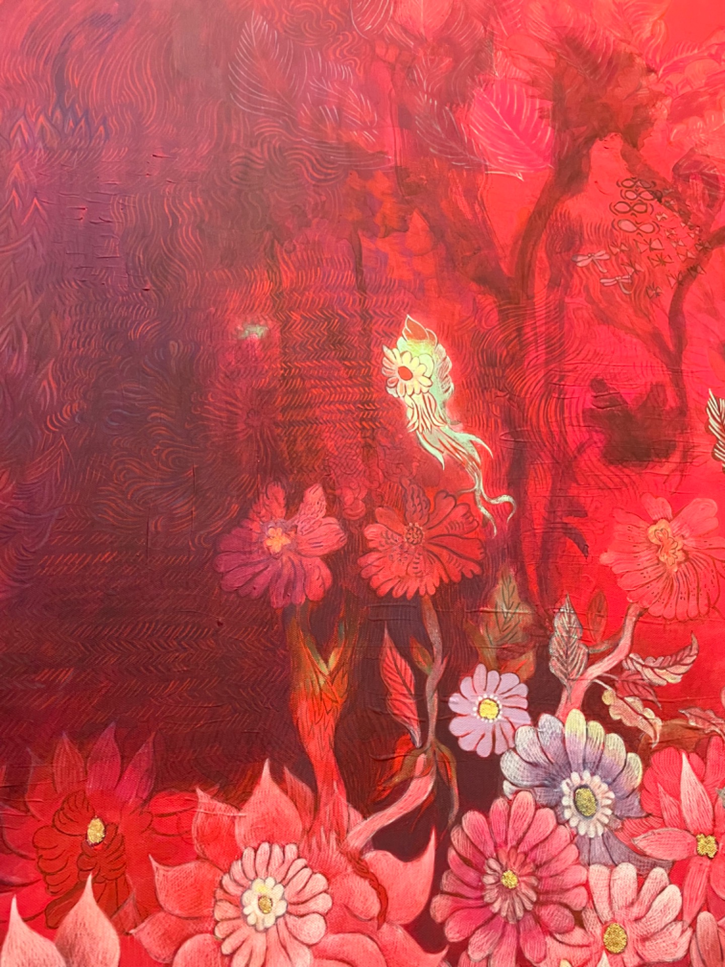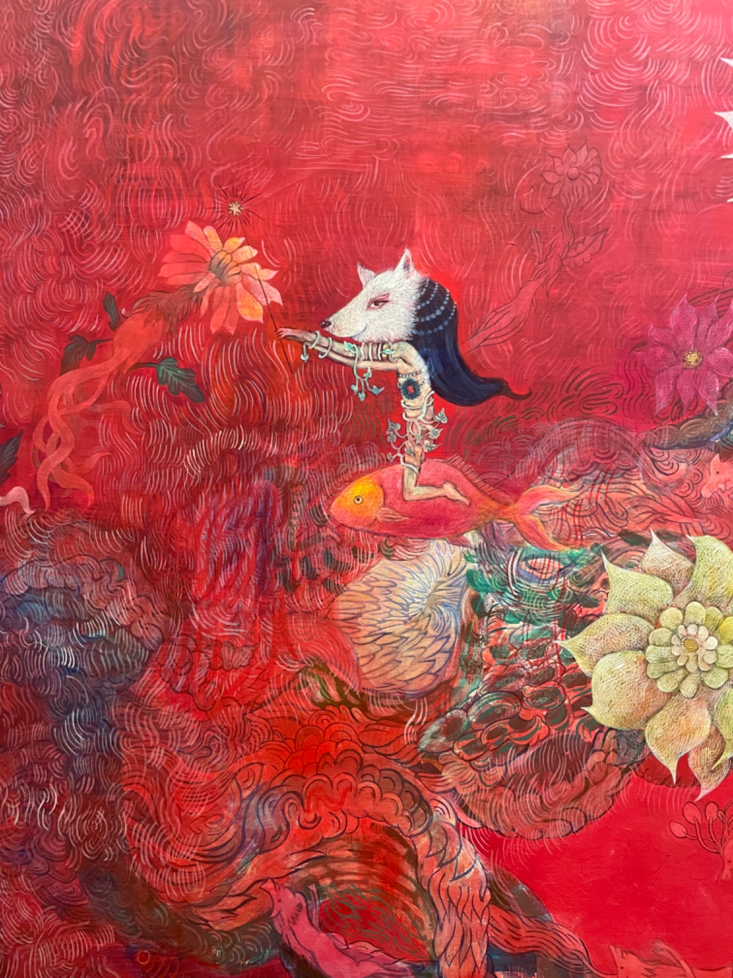 InstagramやTikTokにもたびたび出てくる画像の赤い絵、タイトル《Red Fish》80号 が飾られます。(こちらの画像は絵の一部)そして、