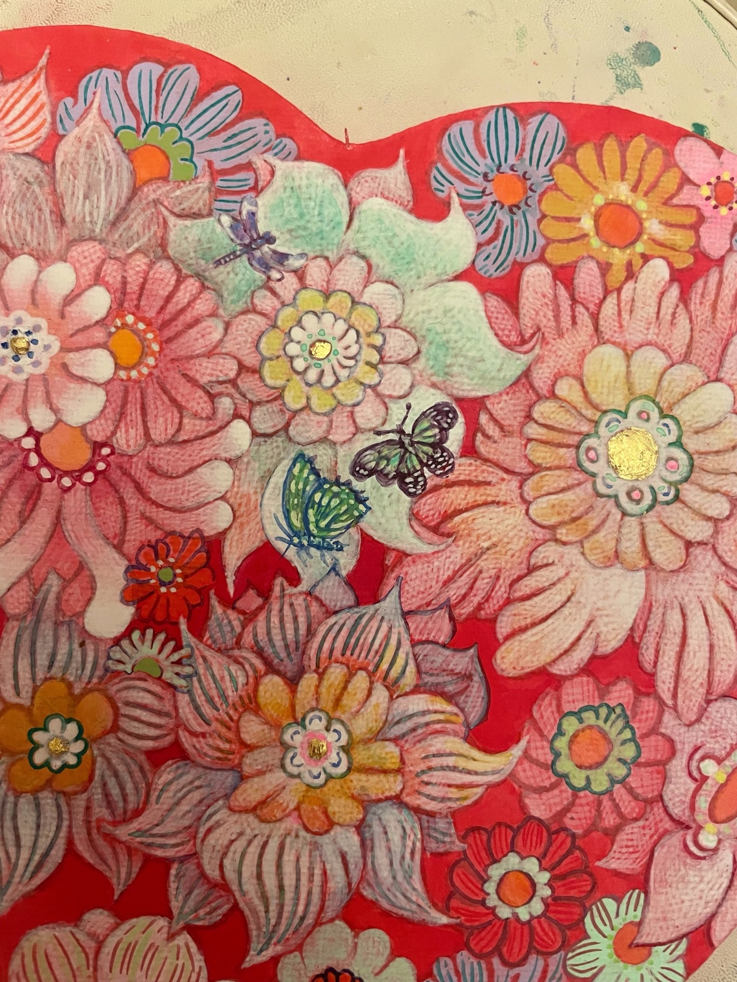 I used to wash my brushes in a bucket, like when preparing for art school exams, but this year, I arranged several containers of water instead. If I don't rinse the brushes often enough, the paint thickens and the brush becomes stiff. In the center of each flower, I've layered and layered sheets of gold leaf—"kirimawashi"—as if saying "enough is never enough," then polished them with an agate burnisher to bring out the shine. I ended up spending about seven hours applying gold leaf to the 30 or so flowers—my own level of focus surprised even me. Honestly, I was a little taken aback.